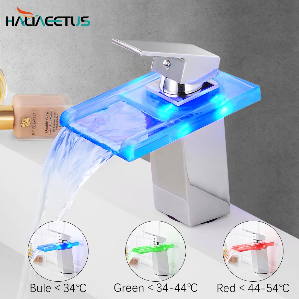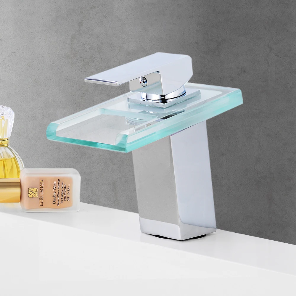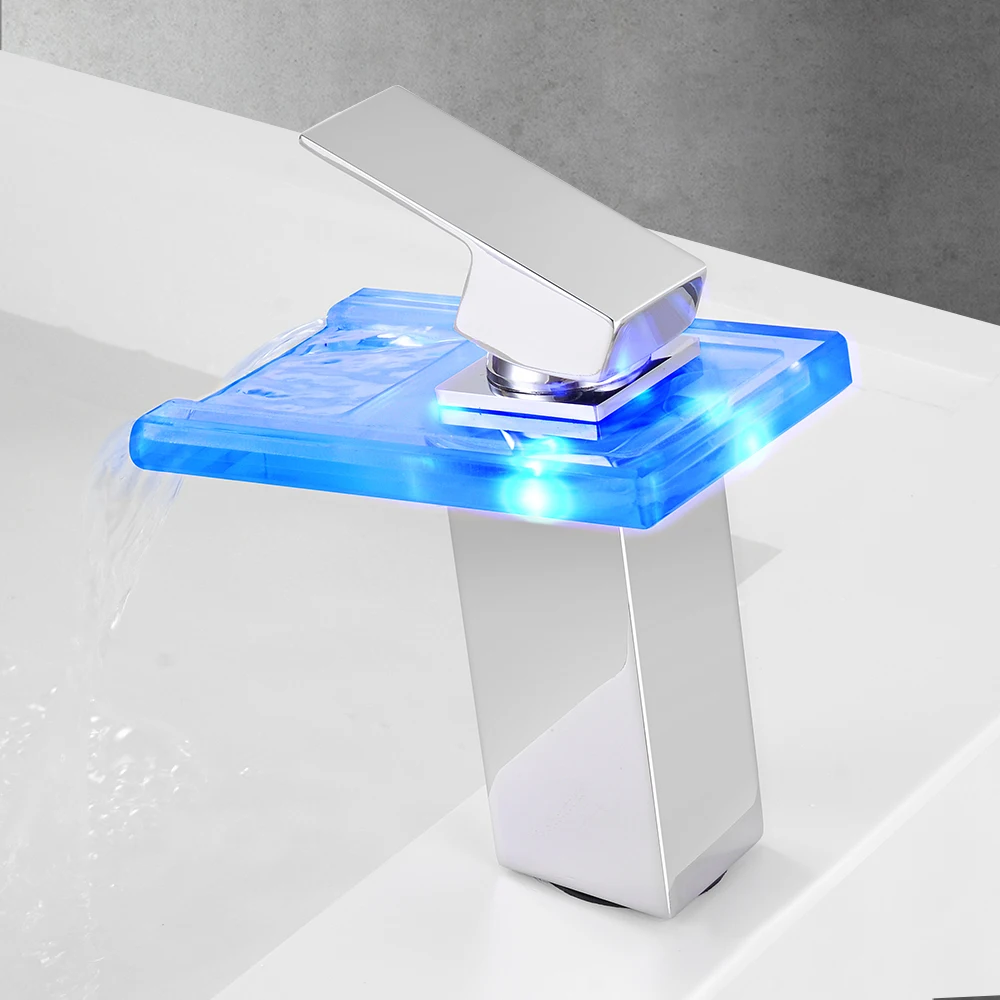 Robinet cascade en verre lumière LED pour salle de bain Torneira Led finition chromée finition colorée monté sur le pont