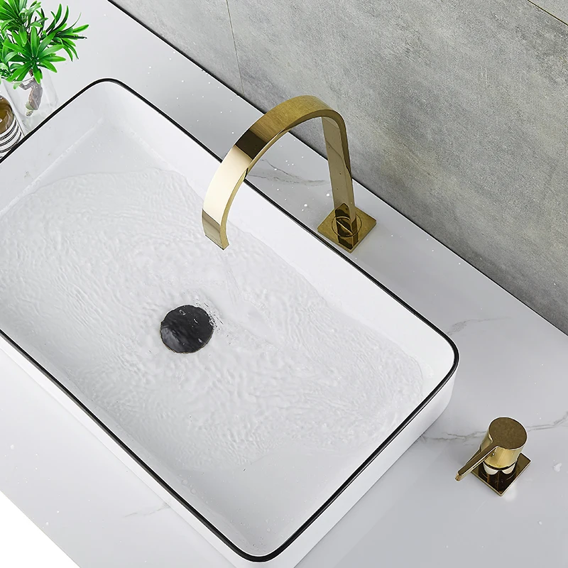Robinet de salle de bains robinet de lavabo très long tuyau deux trous en or brossé/noir robinet de salle de bains évier 360 rotatif